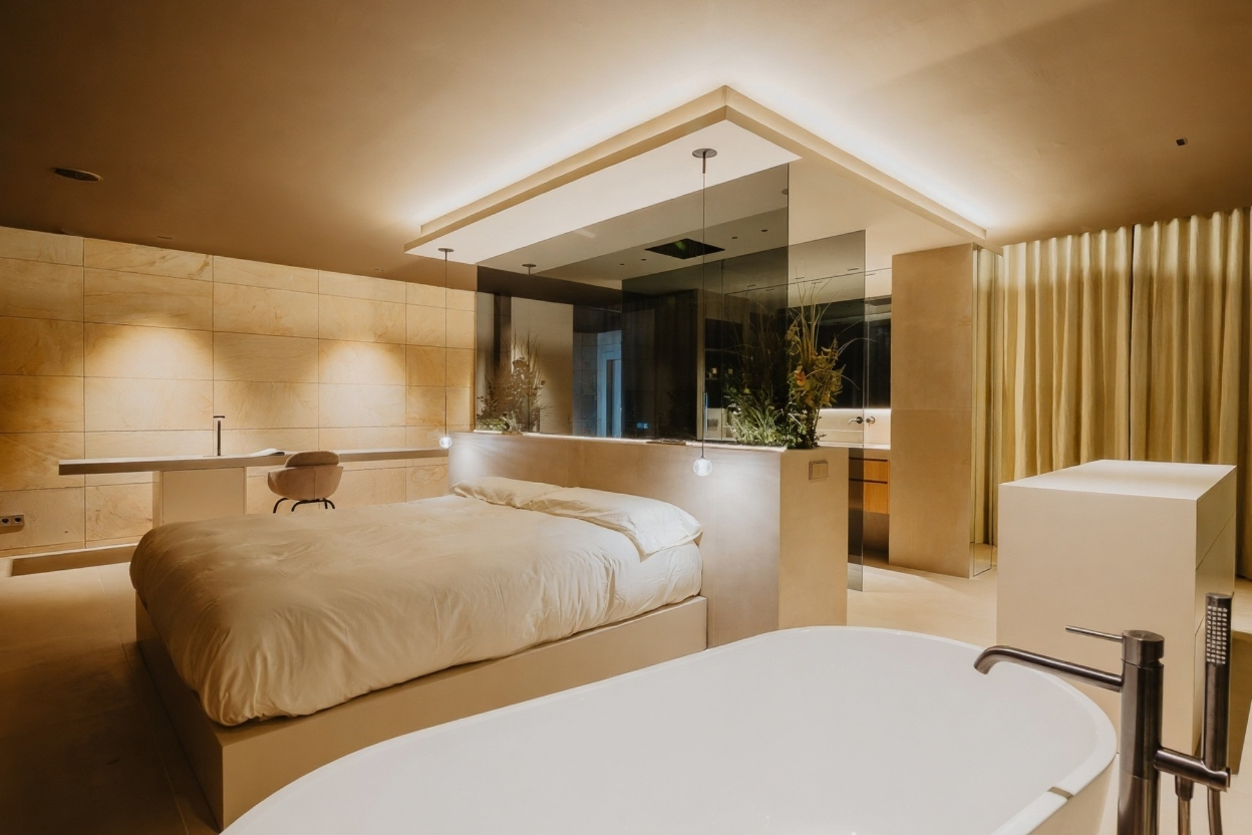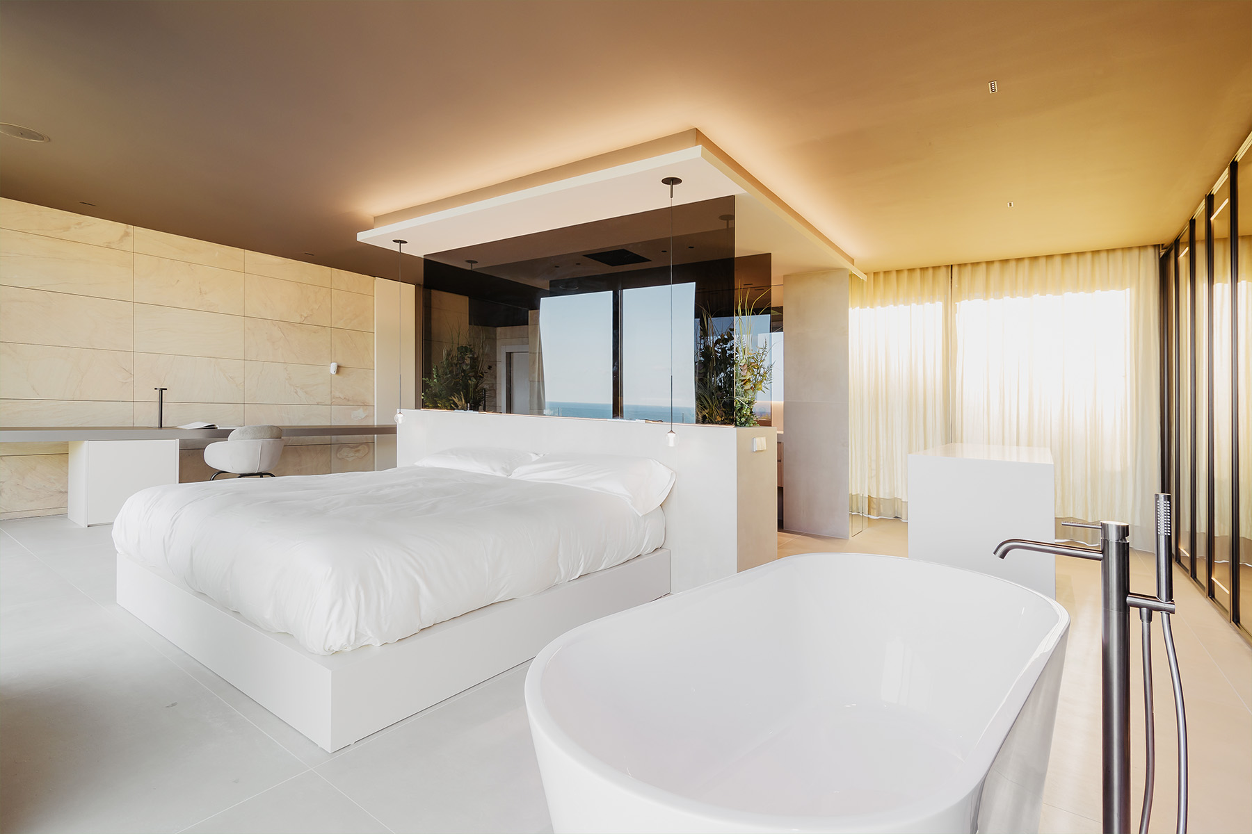La suite principal de 50 m² és el cor d’aquest projecte d’interiorisme a Sitges, on el volum central del bany esdevé l’element arquitectònic que organitza tota la distribució: zona de descans, vestidor, espai de treball i accés directe a la terrassa posterior.