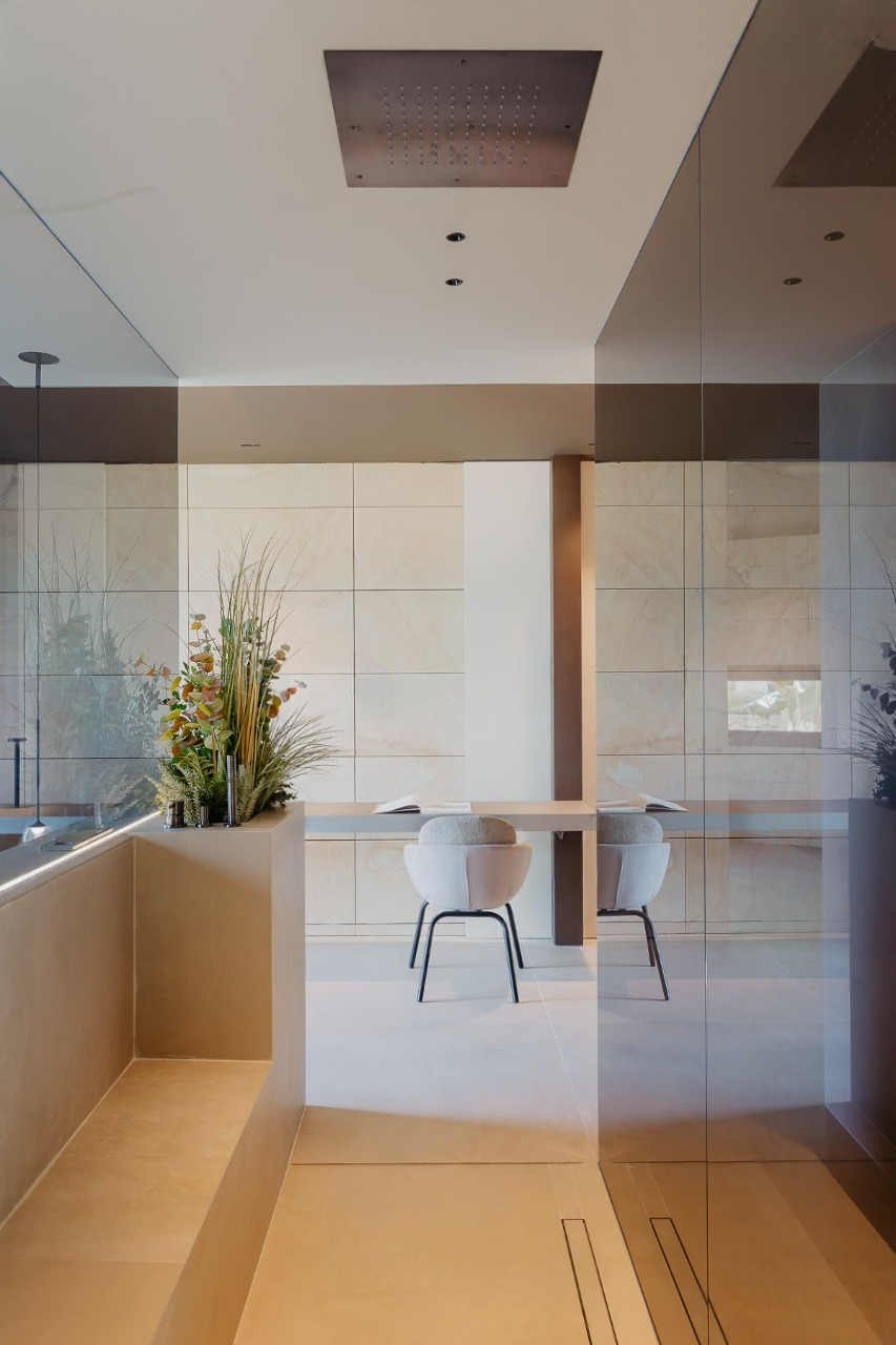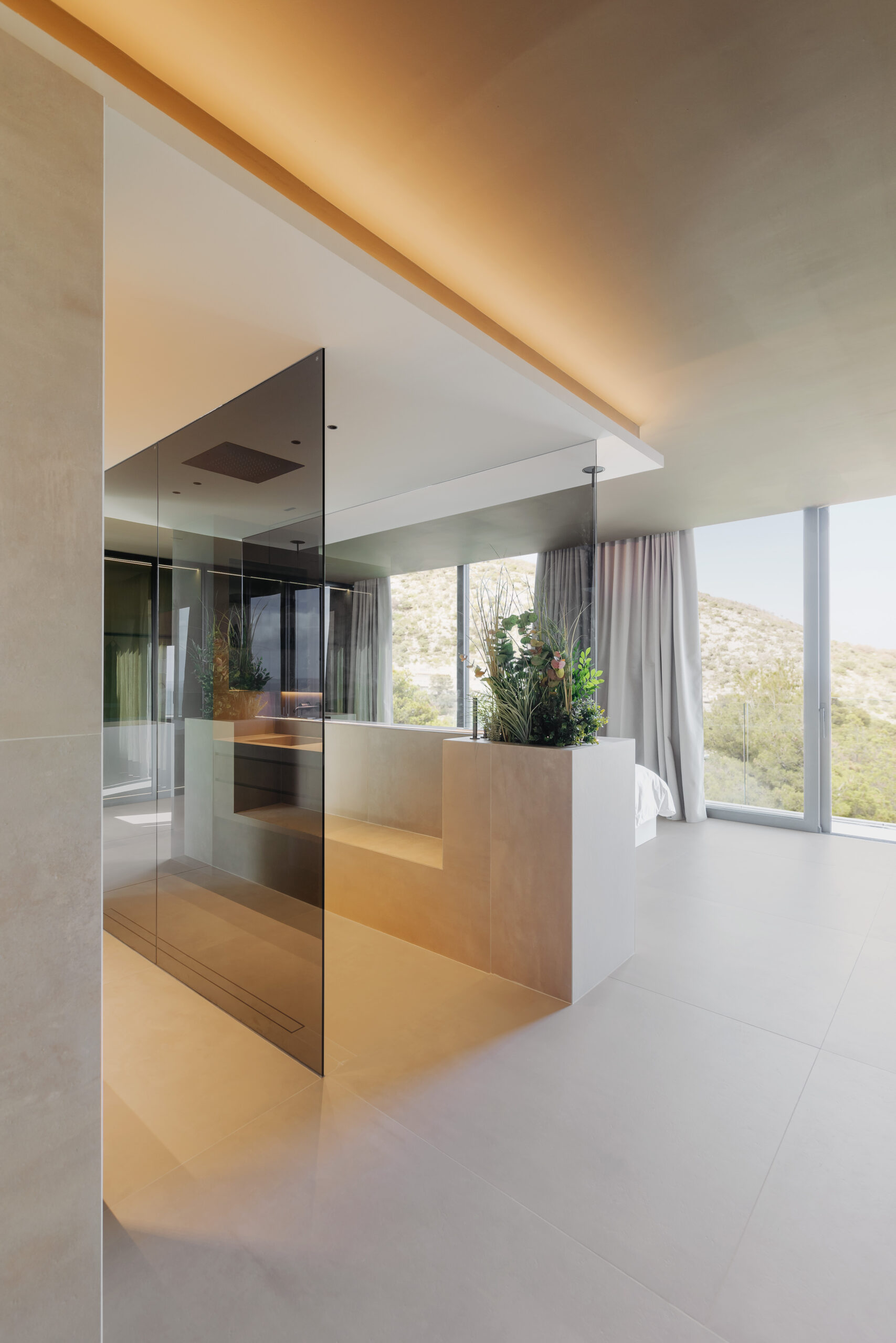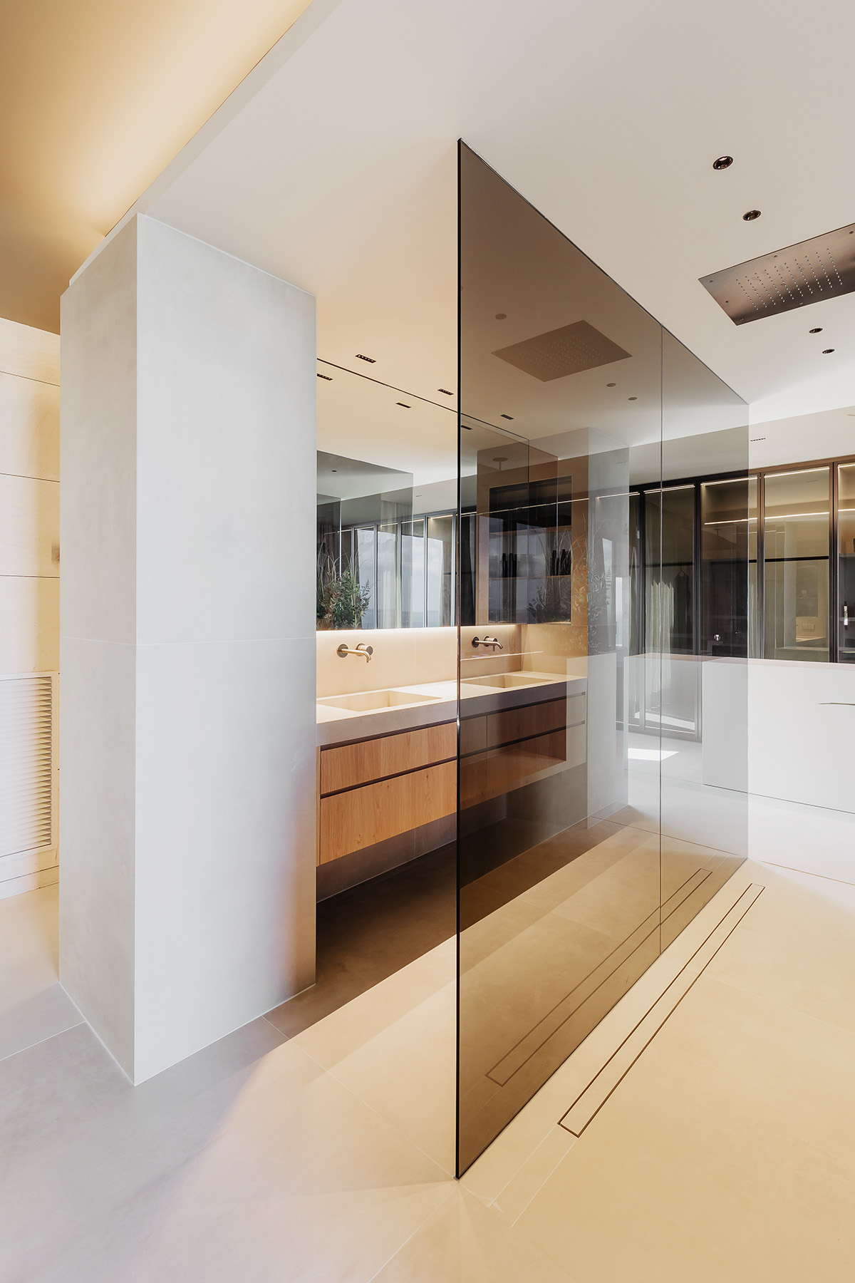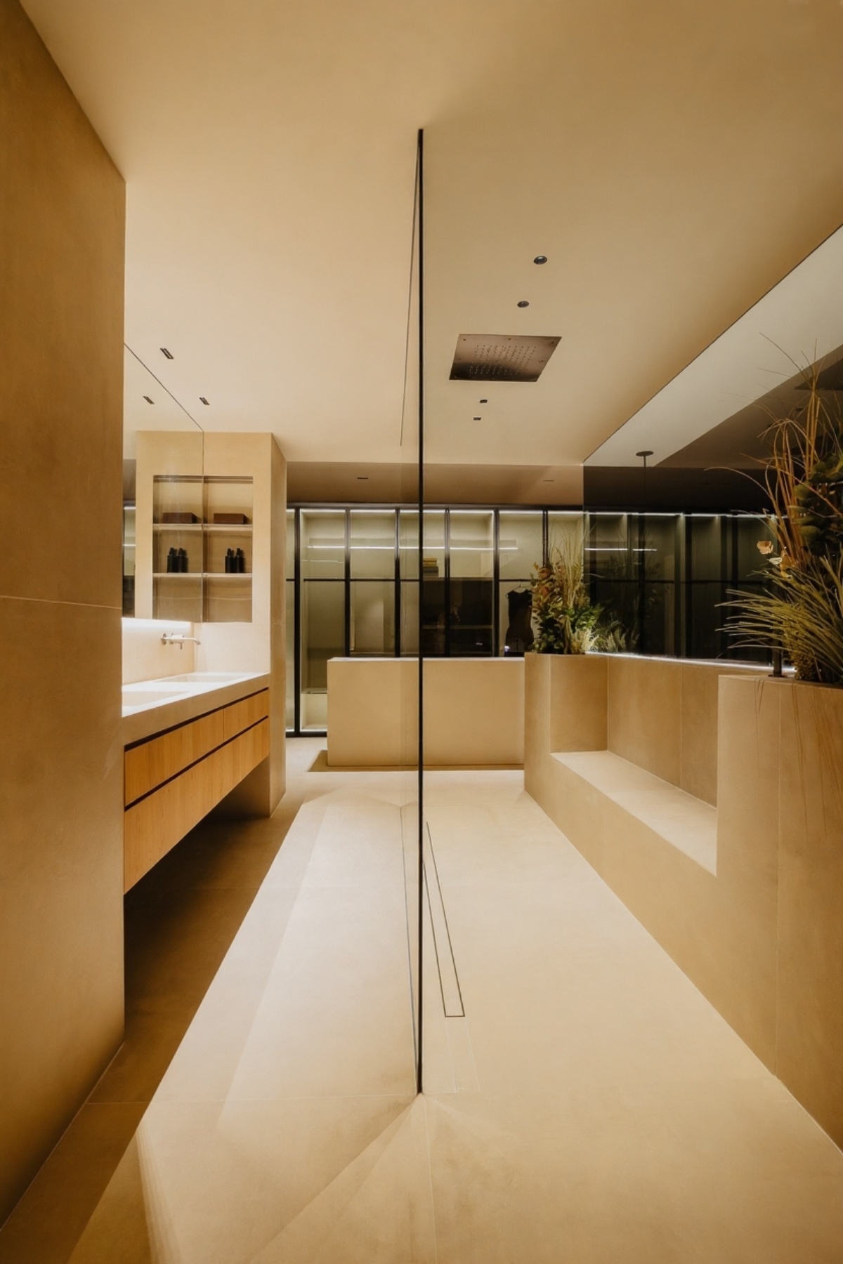 Aquest volum acull un doble rentamans i una dutxa de pluja amb banc integrat, que connecta visualment amb el capçal del llit i crea una continuïtat fluida entre els diferents ambients.