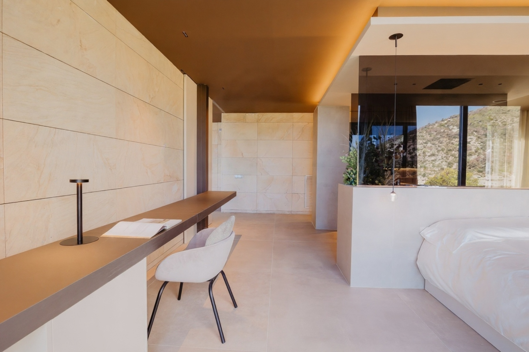 El disseny juga amb vidre fumat i miralls estratègicament col·locats, que multipliquen la llum i reflecteixen el paisatge exterior dins l’habitació.